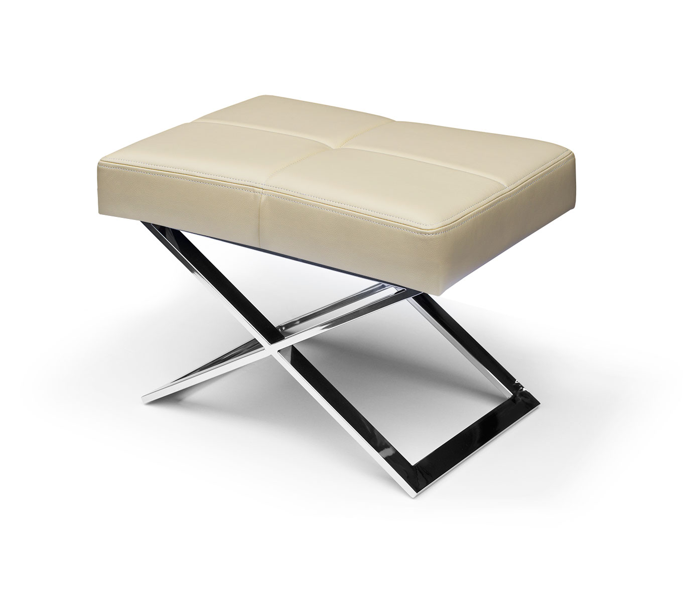 Schicker Bauhaus Leder Hocker mit X-förmigen Edelstahl Beinen. Abbildung Leder Creme Beige.
